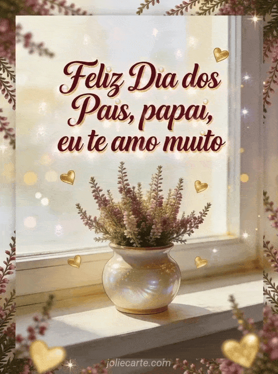 Envie palavras carinhosas Dia dos Pais com caligrafia bordô profunda, um vaso de cerâmica realista cheio de urze em uma janela iluminada, pequenos corações dourados e bokeh quente e brilhante. Veja também bom domingo dia dos pais, feliz dia do pai meu amor ou um texto de amor de Dia dos Pais.