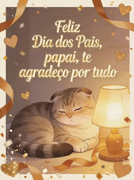 Envie palavras doces Dia dos Pais com escrita creme terna, uma ilustração pastel acolhedora de um gato Scottish Fold enrolado ao lado de uma luminária de mesa brilhante, pequenos corações, fitas âmbar e confete de celebração. Veja também desejar feliz dia dos pais a um amigo, um gif original de Dia dos Pais ou meu amor meu querido feliz Dia dos Pais.