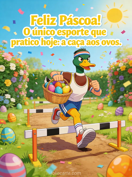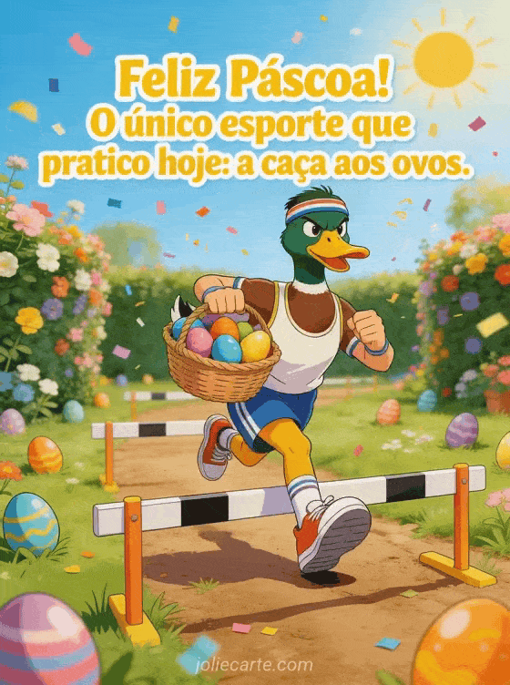 Envie um GIF de PÔscoa engraçado com um pato esportista correndo por um jardim caçando ovos. O único esporte que vale a pena hoje! Descubra também imagens de PÔscoa engraçadas ou um GIF de PÔscoa com humor e um cartão de PÔscoa humor adulto.