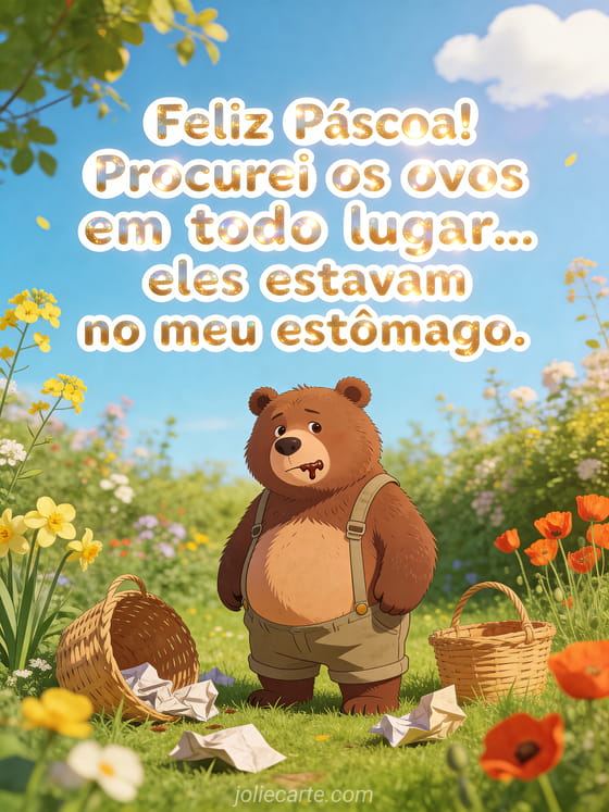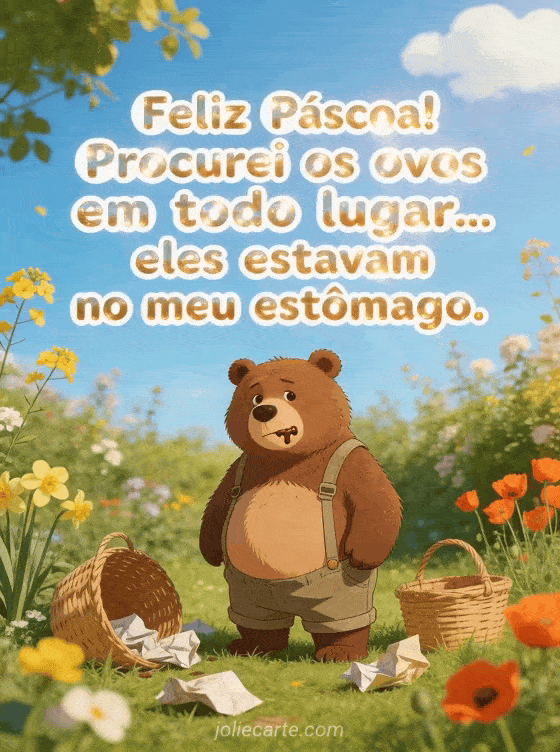 Celebre com este lindo cartao animado. Envie esta mensagem de Feliz Páscoa! Procurei os ovos em todo lugar... eles estavam no meu estômago. para seus entes queridos de forma gratuita. Descubra tambem Pascoa engracada ou Pascoa engracada.