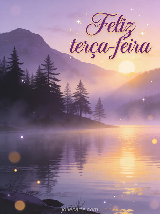 Envie uma mensagem tranquila de feliz terça-feira com um nascer do sol dourado sobre um lago de montanha com bruma e letras roxas elegantes. Veja também um feliz terça-feira e tenha um bom dia gif, uma feliz terça-feira beijinhos imagens ou um feliz terça-feira bom dia gif.