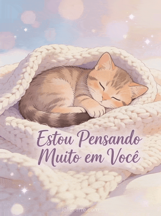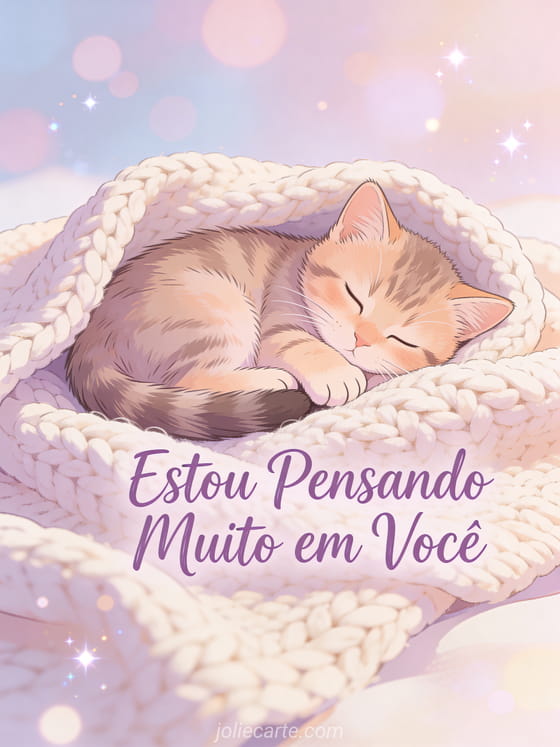 Mostre que vocĂȘ estĂĄ pensando em alguĂ©m especial com esta mensagem terna: um gatinho dormindo enrolado numa manta de tricĂŽ com cores pastel suaves e uma atmosfera sonhadora. Descubra tambĂ©m uma ecard penso em vocĂȘ ou uma pensando em vocĂȘ gif animado.