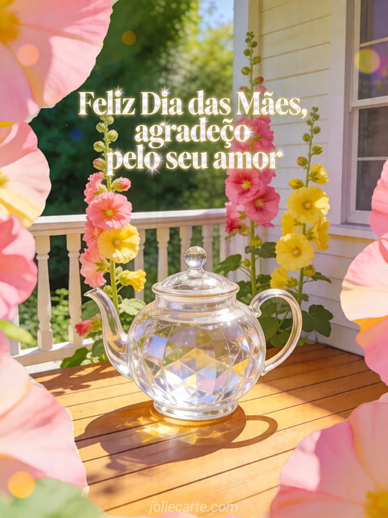 Agradeça à mamãe por seu amor com um cartão luminoso que mostra um bule de cristal emoldurado por altas malvas-rosas em uma varanda ensolarada. Você também pode enviar o Dia das Mães, como desejar feliz Dia das Mães para sua mãe ou foto de Dia das Mães.