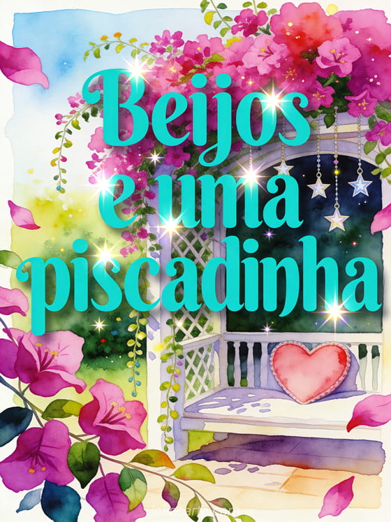 Compartilhe uma mensagem divertida com letras turquesa brilhantes, reflexos de estrelas, um canto de jardim, flores fúcsia, pingentes de estrela, uma almofada em forma de coração, folhas em cascata e brilho festivo. Você também pode enviar enviando beijos gif, uma chuva de beijos gif ou enviar beijos gif.