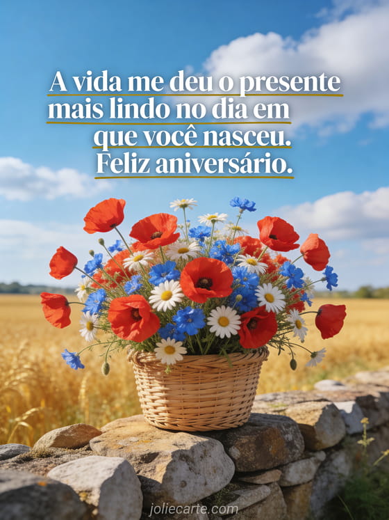 Diga ao seu filho o quanto ele significa para você com este tocante cartão de poema de aniversário. Um magnífico buquê campestre de papoulas vermelhas, centáureas e margaridas numa cesta de vime, com um campo dourado ao fundo. Descubra também um texto aniversário filho adulto ou um feliz aniversário filho adulto.