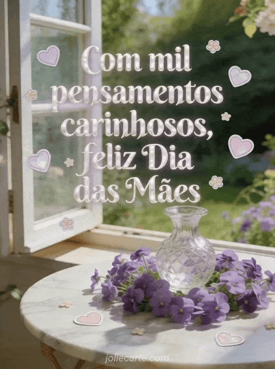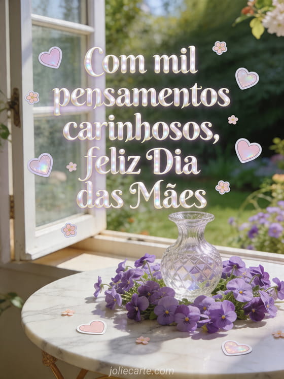 Compartilhe um poema curto para o Dia das Mães em um cartão realista e elegante com corações pastel, pequenas flores, violetas, um vaso de cristal, mesa de mármore e janela aberta para o jardim. Veja também imagens gratuitas do Dia das Mães, feliz domingo feliz Dia das Mães ou cartões virtuais gratuitos para o Dia das Mães.