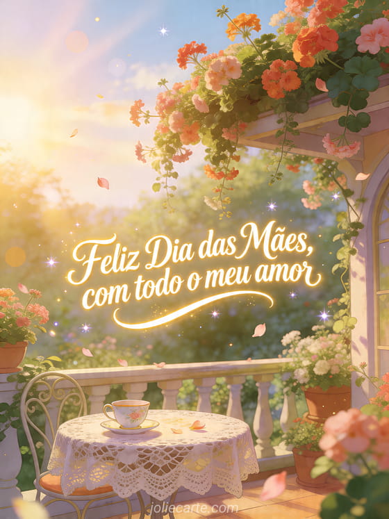 Compartilhe um cartão alegre de Dia das Mães com caligrafia marfim, um terraço de jardim de livro de histórias, gerânios em cascata, mesa de renda e uma xícara de porcelana na luz do nascer do sol. Veja também um poema de amor Dia das Mães, feliz Dia das Mães e bom domingo ou feliz Dia das Mães mãe falecida.