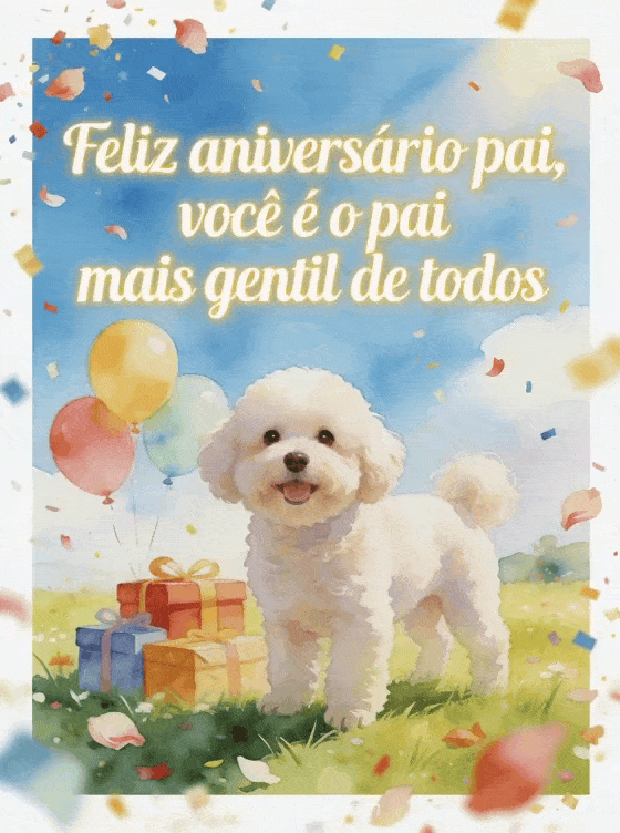 Compartilhe um poema de aniversário para pai de uma criança com um cachorro bichon frisé em uma campina iluminada ao lado de presentes e balões de aniversário. Você também pode enviar poema de aniversário para pai, texto de aniversário para seu pai ou feliz aniversário pai gif.