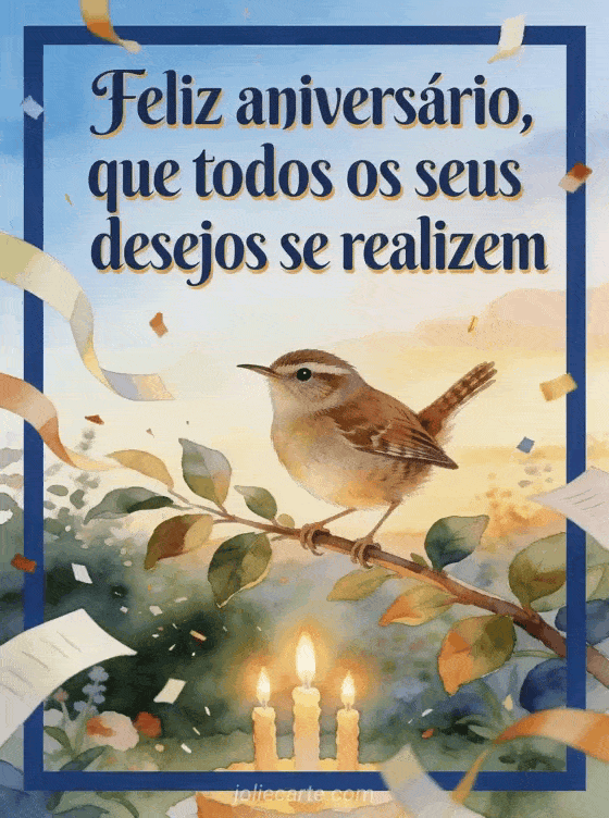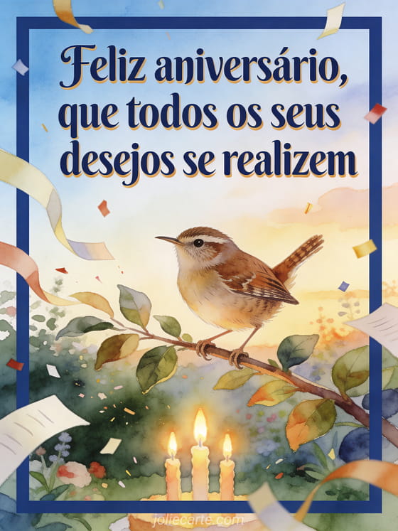 Envie uma mensagem de aniversário poética com uma corruíra sobre um galho, velas acesas e um jardim em aquarela ao amanhecer. Fitas e confetes deixam o cartão mais luminoso e festivo. Veja também um feliz aniversário meu filho adulto, um cartão aniversário filho adulto grátis ou um poema de uma mãe para o filho no aniversário dele.