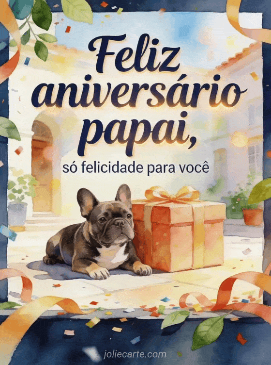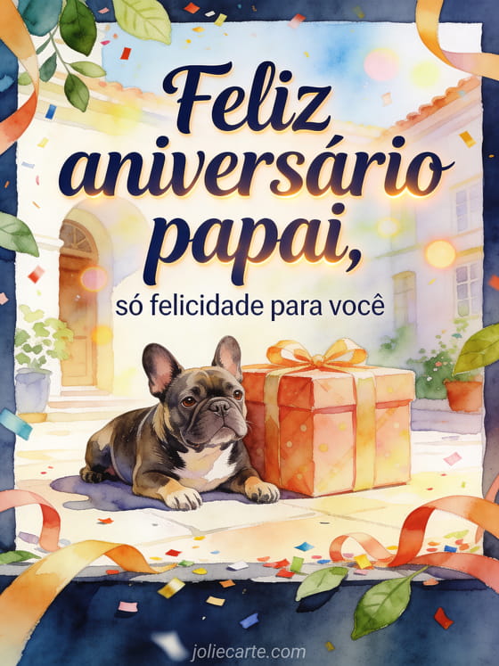 Envie um poema de aniversário para papai grátis com letras azul-marinho em pincel, um buldogue francês ao lado de uma grande caixa de presente em um pátio claro, fitas, folhas e confete sobre a borda. Veja também um poema para papai pelo aniversário dele, um feliz aniversário papai eu te amo gif ou um feliz aniversário papai cartão de aniversário.