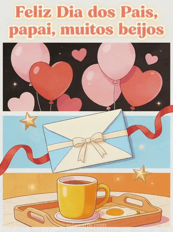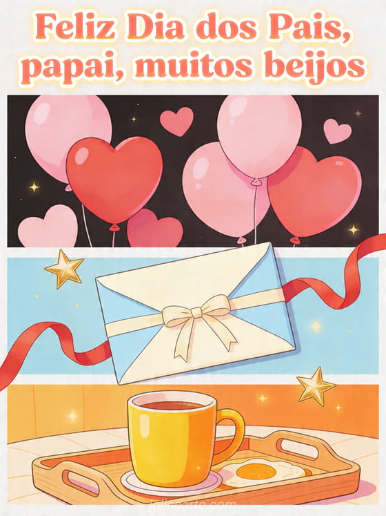 Compartilhe um cartão ilustrado e alegre de Dia dos Pais com balões em forma de coração, um envelope selado com fita e uma bandeja de café da manhã com uma xícara colorida. É uma forma doce de enviar muitos beijos ao papai. Veja também cartões do Dia dos Pais, feliz dia dos pais para meu filho e todos os papais ou modelo cartão Dia dos Pais.