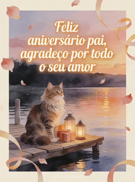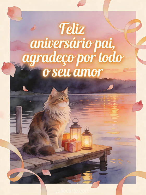 Compartilhe um poema de feliz aniversário para meu pai com um gato Maine Coon ao lado de lanternas e presentes embrulhados em um deque de madeira junto à água calma. Você também pode enviar poema de amor para pai para seu aniversário, cartão de aniversário para pai ou poema poema pai feliz aniversário.