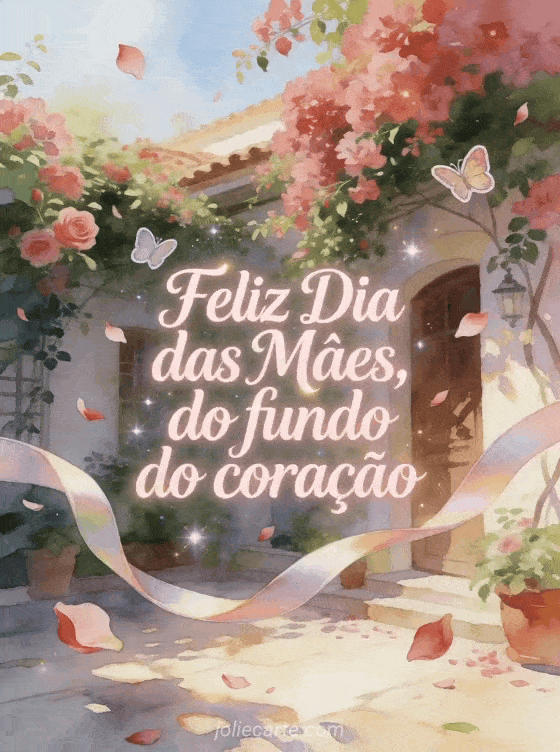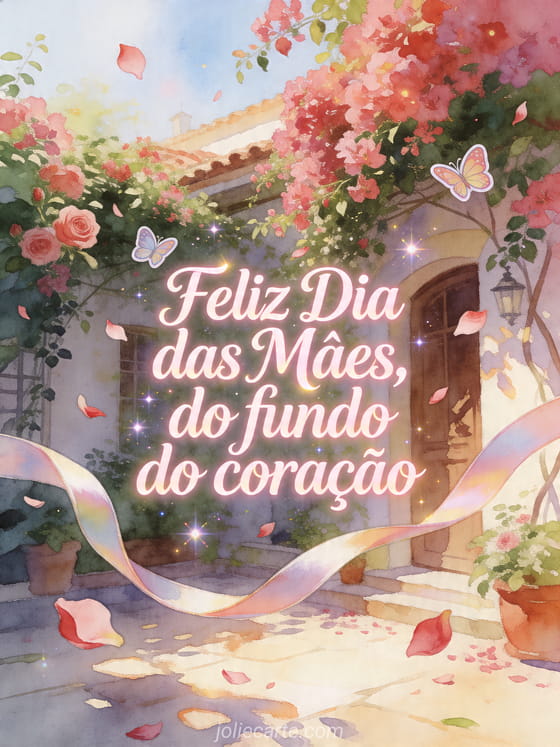 Compartilhe um poema do Dia das Mães com escrita rosada leve, pétalas de rosa, pequenas borboletas e um pátio luminoso envolto em buganvília. Uma fita de seda dança na brisa neste cartão emocionante pintado à mão. Veja também poema de amor para o Dia das Mães, poema de amor Dia das Mães ou feliz Dia das Mães e bom domingo.