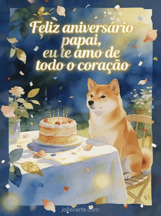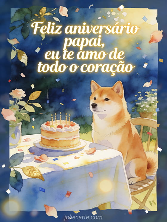 Envie um poema para papai pelo aniversário dele com letras creme elegantes, um Shiba Inu ao lado de um bolo de aniversário em uma mesa de jardim ensolarada, pétalas, folhas e confete sobre a borda. Veja também um feliz aniversário papai eu te amo gif, um feliz aniversário papai cartão de aniversário ou uma carta de aniversário para seu pai.