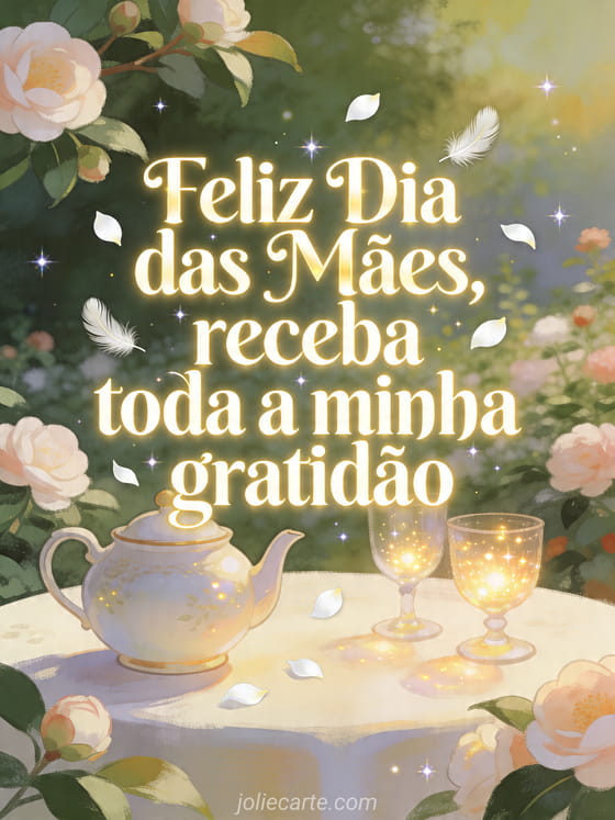 Compartilhe um cartão luminoso de Dia das Mães com uma mesa de jardim de camélias, bule de porcelana, vidraria brilhante e pétalas suaves. Você também pode enviar um trocadilho Dia das Mães, feliz Dia das Mães minha nora ou feliz Dia das Mães.