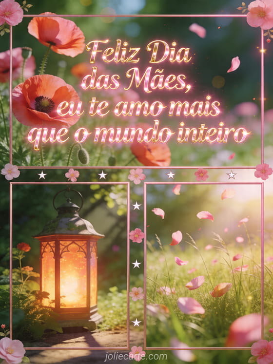 Compartilhe um cartão radiante de Dia das Mães com escrita rosé-dourada, papoulas vivas, uma lanterna de jardim brilhante, pétalas ao vento e uma campina iluminada pelo sol. Veja também textos para o Dia das Mães, feliz Dia das Mães imagens ou fotografias para o Dia das Mães.