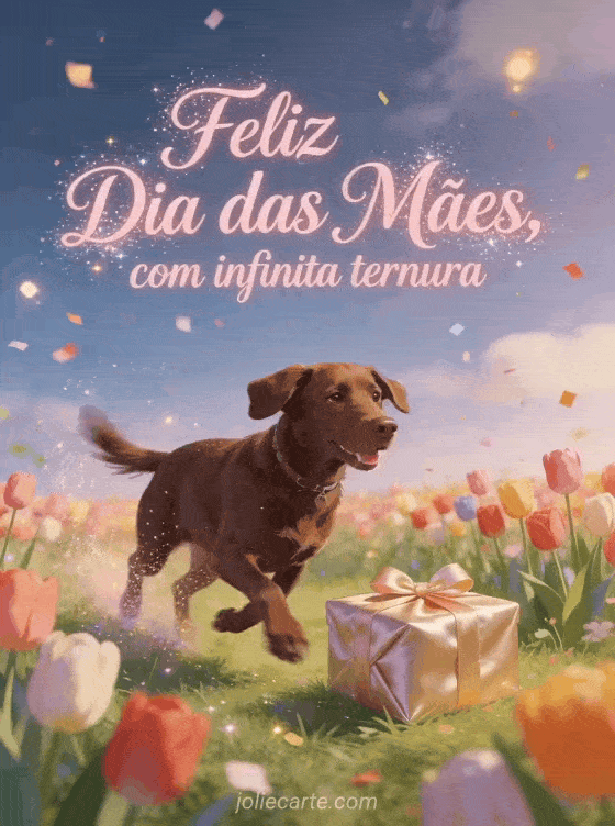Compartilhe poesias para o Dia das Mães em um cartão ilustrado vivo com campina de tulipas, cachorro labrador chocolate, caixa de presente de cetim, confetes brilhantes e cores alegres. Veja também mensagens de Dia das Mães, imagem para o Dia das Mães ou foto do Dia das Mães.