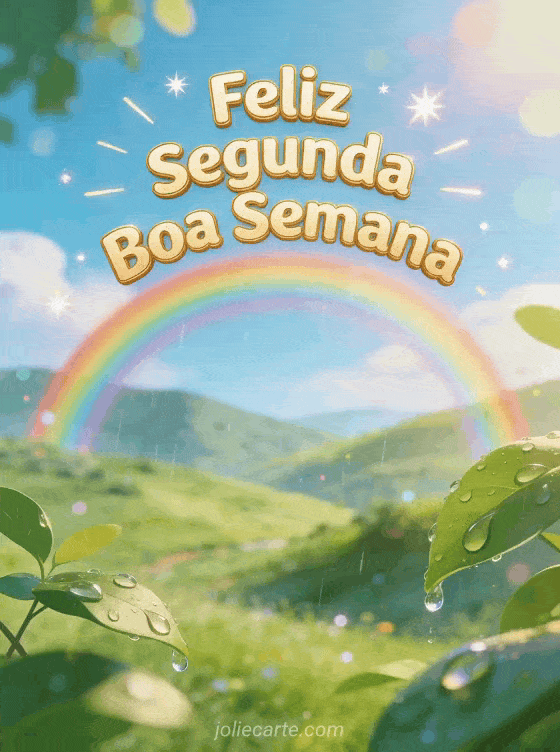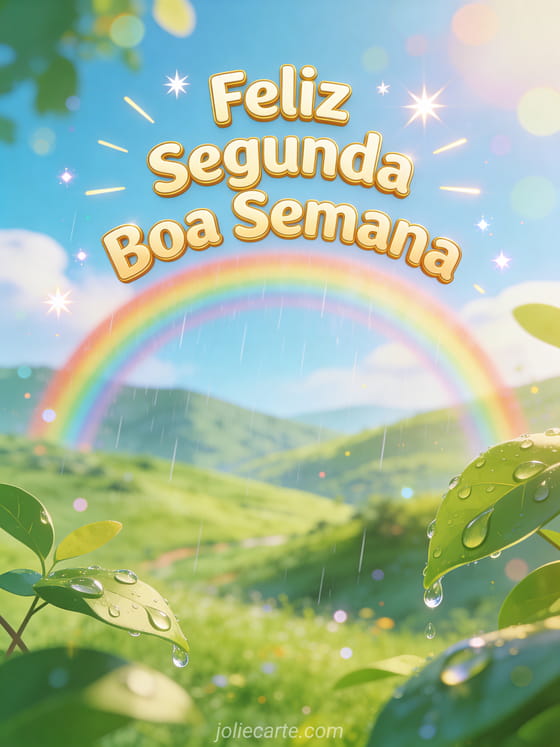 Comece a semana com otimismo enviando este lindo cartão de feliz segunda. Um vibrante arco-íris depois da chuva se estende sobre um vale verde, cheio de energia positiva. Descubra também um cartão divertido de motivação da segunda ou um cartão gif de feliz segunda.