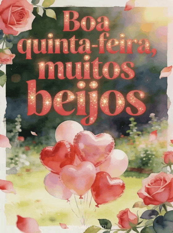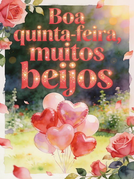 Compartilhe boa quinta-feira, muitos beijos com letras vermelho-rosa, balões em forma de coração em uma clareira de jardim luminosa, rosas e pétalas cruzando a borda. Veja também belas imagens para feliz quinta-feira, feliz quinta-feira ensolarada imagem ou imagens para boa quinta-feira.