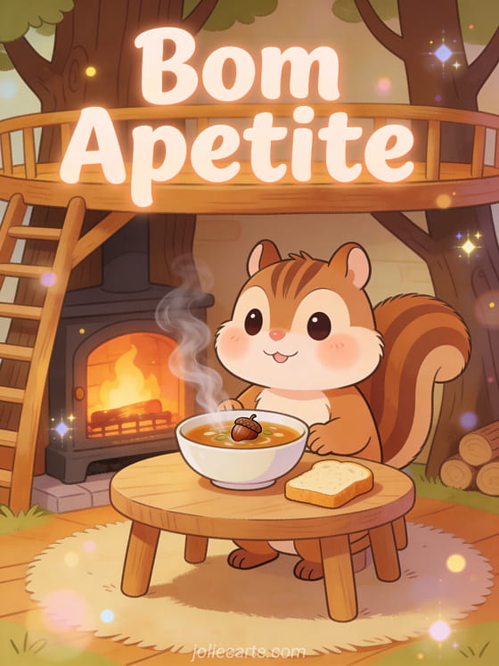 Envie este adorável bom apetite com um esquilo de desenho animado com bochechas gordas sentado numa mesinha com uma tigela de sopa de bolotas e pão numa casinha aconchegante na árvore. Descubra também um cartão bom apetite natal imagem ou um cartão bom apetite gif imagem.