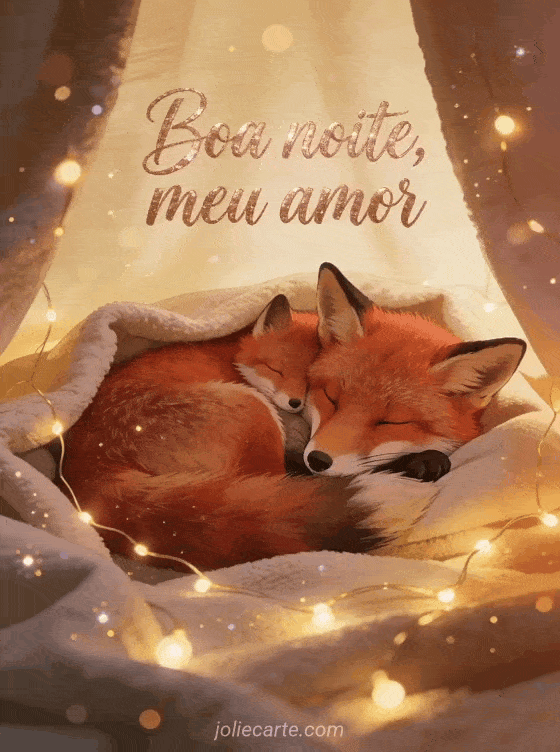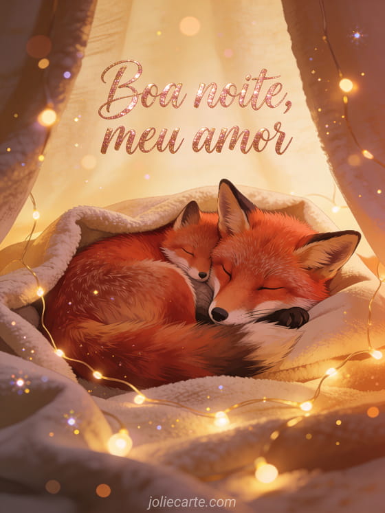 Envie um romântico desejo de boa noite para o amor da sua vida com este belo cartão grátis. Um casal de raposas aconchegadas sob luzes de fada, perfeito para uma boa noite terna. Descubra também um cartão eu te amo boa noite meu amor ou um cartão boa noite eu te amo meu amor gif.