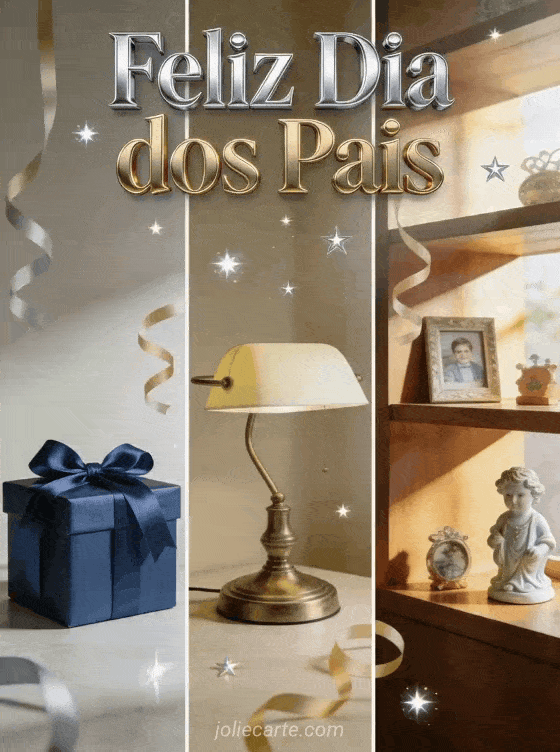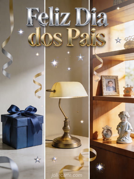 Compartilhe um cartão acolhedor e realista de Dia dos Pais com uma caixa de presente azul, uma lâmpada de mesa clássica e uma prateleira de madeira iluminada com pequenas lembranças, fitas e estrelas. Este design elegante é simples, alegre e fácil de enviar. Veja também cartão coração de Dia dos Pais, feliz dia papai e mamãe ou feliz dia dos pais ao meu filho.