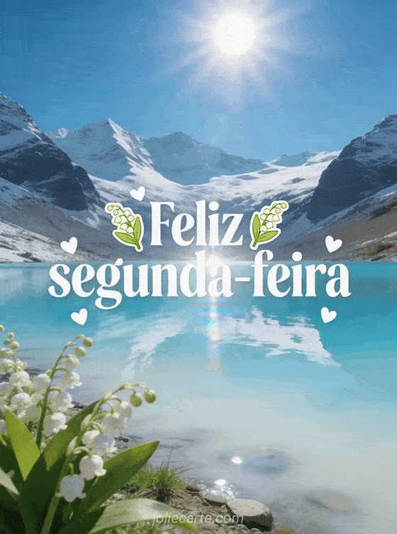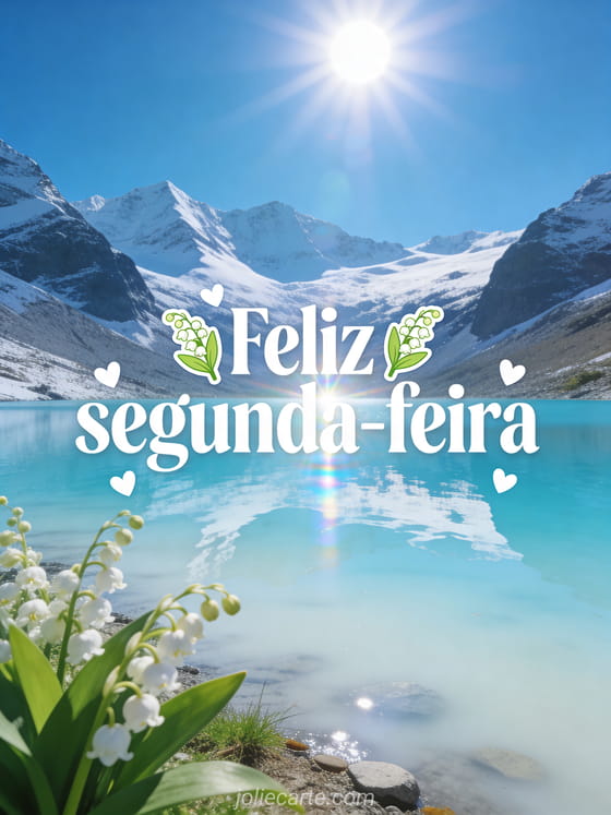 Compartilhe um cartão fresco de segunda-feira com letras brancas puras, lírios-do-vale, pequenos corações brancos, um lago glacial azul leitoso e montanhas nevadas sob o sol. Você também pode enviar boa segunda-feira humor engraçado, uma feliz segunda-feira gato beijos imagem ou estas feliz segunda-feira chuvosa imagens.