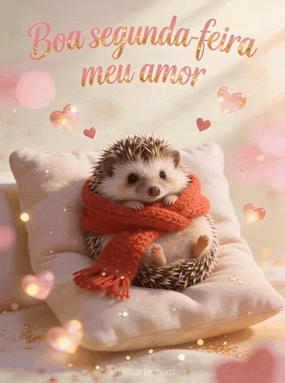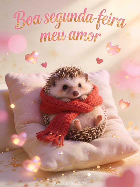 Envie uma ternura de boa segunda-feira ao seu amor com este doce cartão romântico com um adorável ouriço aninhado num cachecol vermelho rodeado de corações luminosos. Descubra também cartões boa segunda-feira boa semana ou positivo boa segunda positivo.