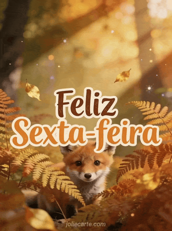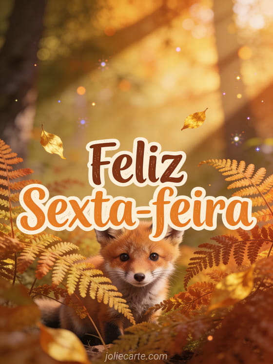 Celebre a sexta-feira com este encantador cartão com uma curiosa raposinha espiando entre samambaias outonais com folhas douradas caindo na calorosa luz da floresta. Descubra também uma imagem de sexta-feira bom dia, uma mensagem para desejar uma feliz sexta-feira ou um cartão feliz sexta-feira.