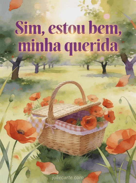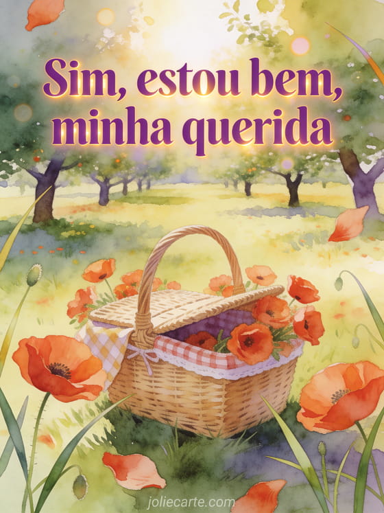 Responda com calma e carinho usando letras violetas em aquarela, papoulas, uma cesta de piquenique em uma clareira ensolarada de pomar, bokeh sereno e luz dourada. Veja também um cartão de como está minha filha, um cartão de olá amigos como vocês estão ou um cartão de como está meu neto.
