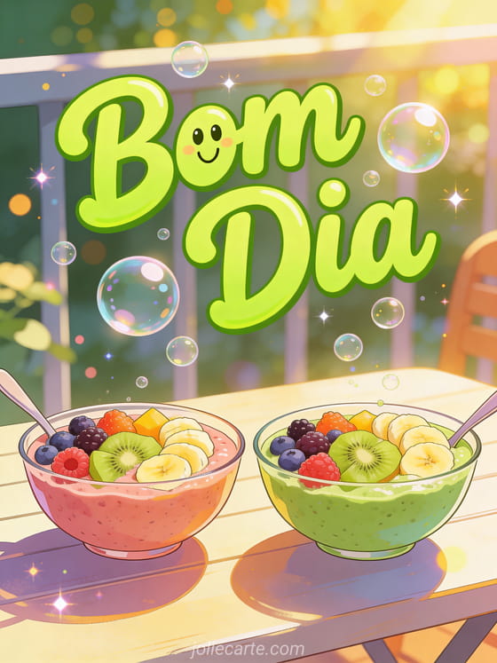 Compartilhe uma alegre e energética saudação matutina com dois coloridos smoothie bowls em um brunch ensolarado. Descubra também um bom dia ao seu namorado ou um manhã bom dia cartão.