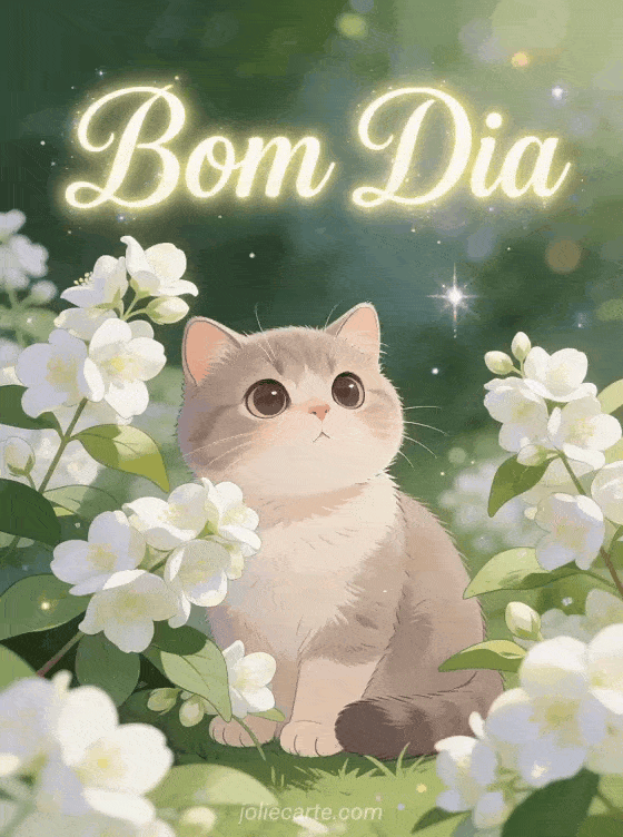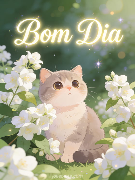 Um doce e irresistível cartão de bom dia com um adorável gato british shorthair de olhos redondos entre flores de jasmim branco em um jardim romântico. Descubra também um bom dia cartão, um bom dia gif animado ou uma mensagem bom dia madrugador.