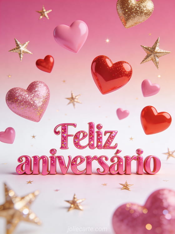 Envie um alegre cartão de aniversário com letras rosa brilhante com efeito de brilho, corações rosas e vermelhos de diferentes tamanhos flutuando entre estrelas douradas cintilantes sobre fundo rosa degradado. Descubra também feliz aniversário mulher com gato ou texto cartão aniversário mulher.