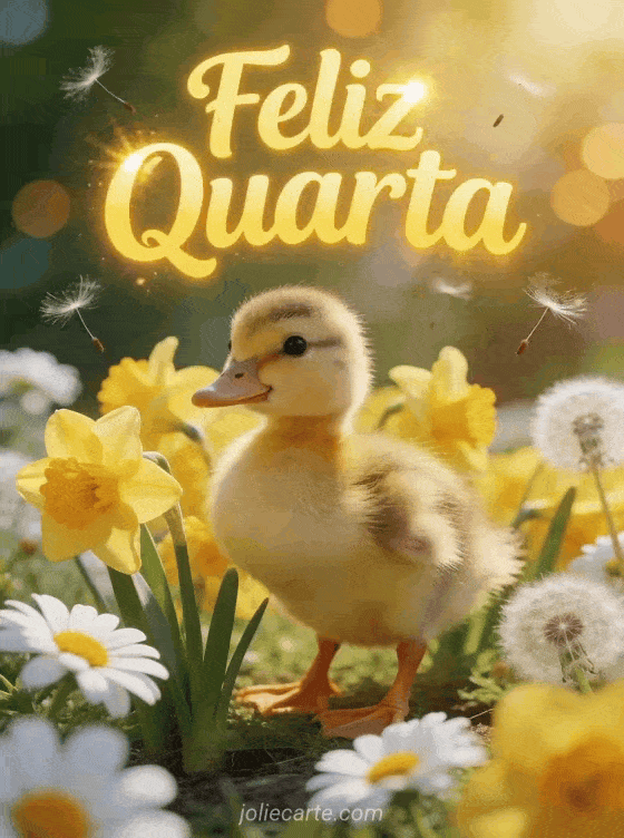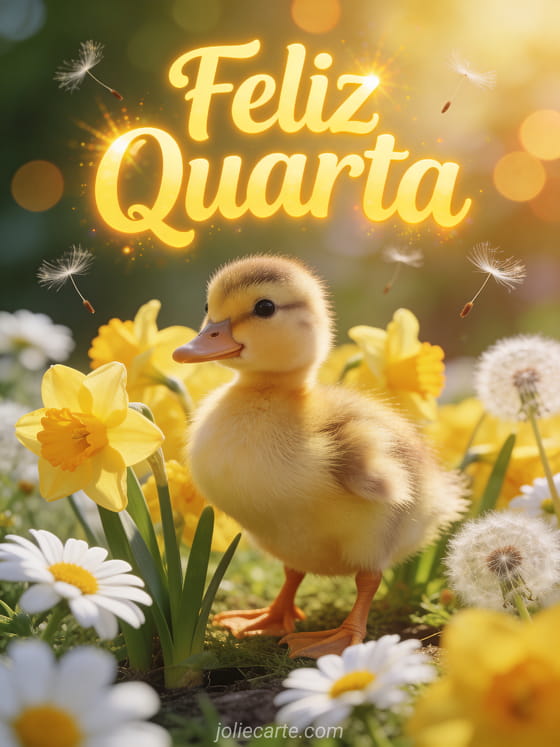Compartilhe um alegre desejo de feliz quarta com este adorável cartão com um patinho entre narcisos amarelos e margaridas. Descubra também imagem feliz quarta amigos ou imagens boa tarde de quarta-feira para mais inspiração.