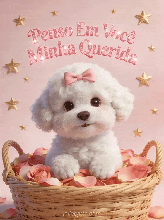 Envie este adorĂĄvel cartĂŁo com um lindo cachorrinho bichon frisĂ© branco com um laço rosa em uma cesta de pĂ©talas de rosa. Descubra tambĂ©m um cartĂŁo penso em vocĂȘ meu amor ou um cartĂŁo coração penso em vocĂȘ.