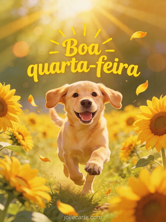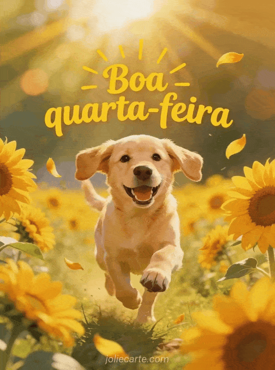 Compartilhe uma boa quarta-feira cheia de alegria com este cartão ensolarado de um labrador sorridente entre girassóis. Veja também imagem quarta-feira chuvosa, foto bom dia boa quarta-feira ou quarta-feira quarta-feira imagem bom dia e bom dia.