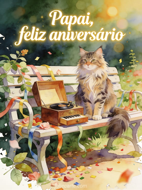 Compartilhe uma mensagem de aniversário para o papai da sua filha com um gato Maine Coon, uma caixa de música aberta e fitas festivas em um banco de jardim. Você também pode enviar carta para o aniversário do papai, feliz aniversário meu papai querido ou feliz aniversário para papai.