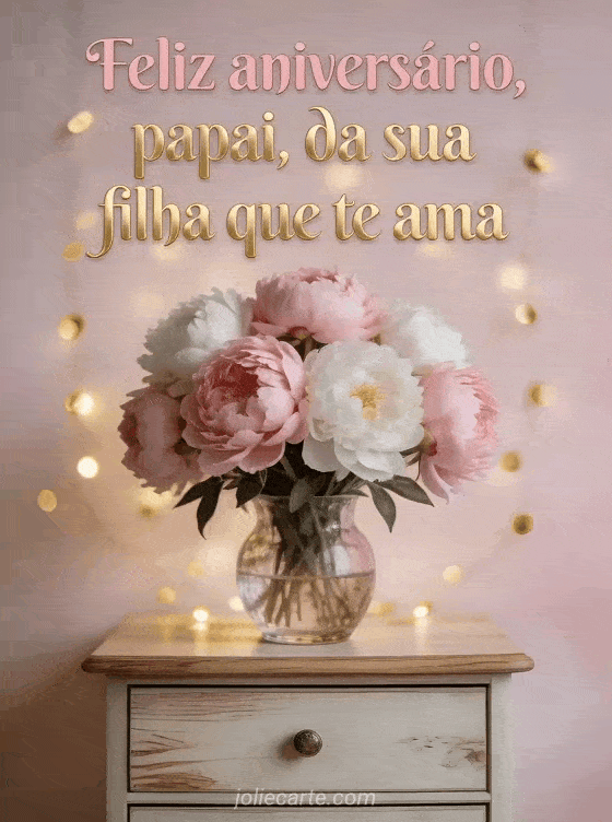 Compartilhe um cartão sua filha feliz aniversário papai com letras rosas e douradas, peônias delicadas e luzes douradas aconchegantes. Veja também um feliz aniversário papai eu te amo, um feliz aniversário pai desenho ou um texto de aniversário para pai.