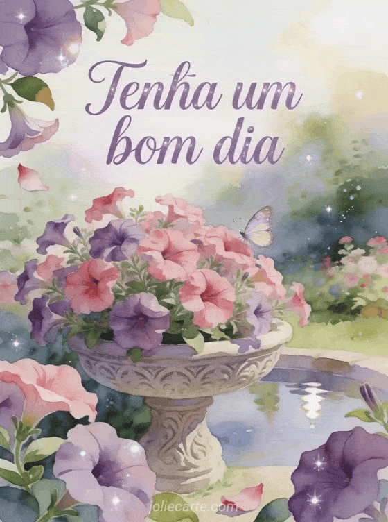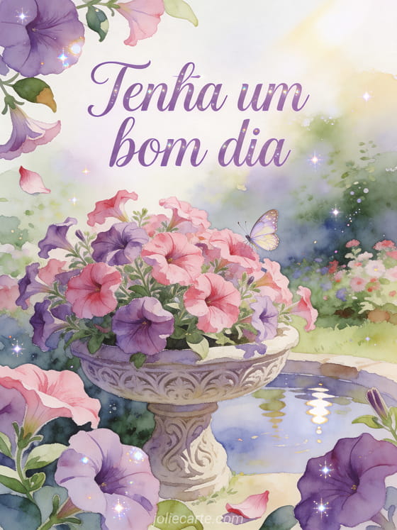 Envie uma saudação delicada de bom dia com letras lavanda, um jardim de petúnias, uma pequena borboleta, um bebedouro para pássaros esculpido e luz da manhã. Veja também um bom dia gato gif, bom dia gifs ou um bom dia chuvoso gif.