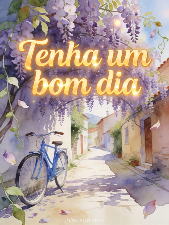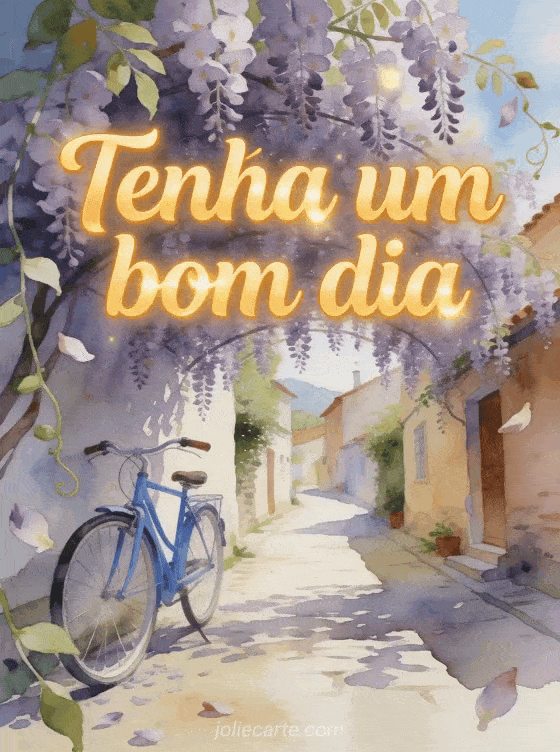 Deseje um bom dia com uma rua charmosa de vilarejo, flores de glicínia arqueadas sobre uma bicicleta azul e cores frescas de aquarela. Você também pode enviar lindo dia beijos gif, bom dia fotos gif ou bom dia beijos gifs animados.