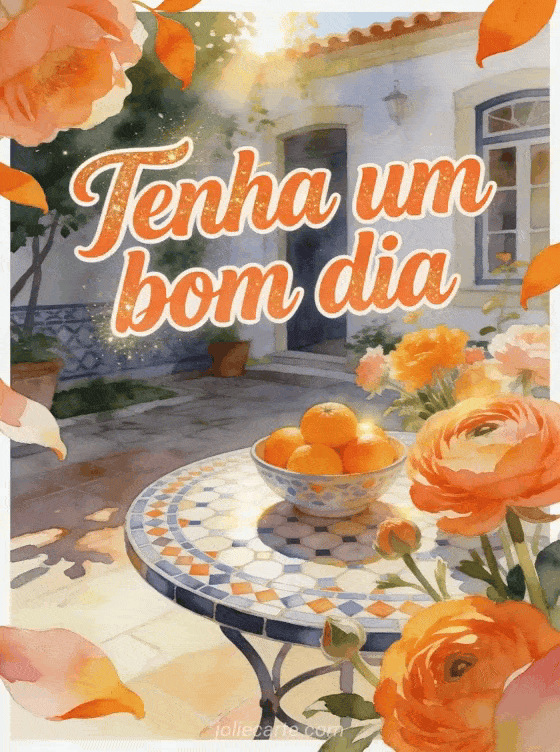 Envie uma saudação alegre de tenha um bom dia com letras coral em aquarela, brilhos dourados, laranjas e flores de ranúnculo. Você também pode compartilhar bom dia ensolarado gifs, bom dia gif zen ou bom dia cachorro gif.