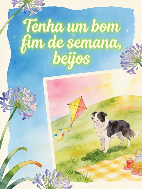 Envie uma saudação divertida de fim de semana com caligrafia verde, agapantos, um cachorro border collie, uma pipa colorida e uma colina gramada ao sol. Veja também carinho bom fim de semana beijos, bom fim de semana beijos ou uma feliz fim de semana beijos gif imagem.