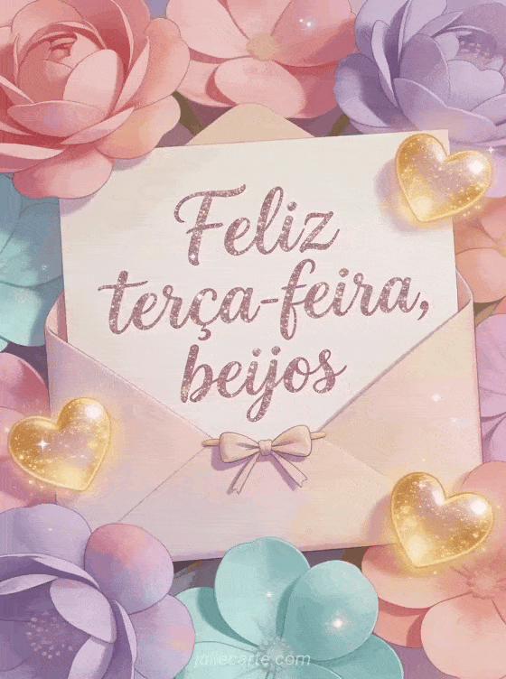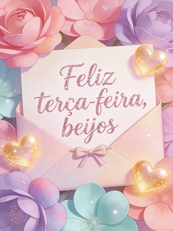 Compartilhe terça-feira beijos com letras suaves, um envelope pastel amarrado com um pequeno laço, pétalas brilhantes e corações luminosos. Você também pode enviar uma feliz terça-feira imagem grátis, uma feliz terça-feira gato imagem ou uma feliz terça-feira sol imagem.