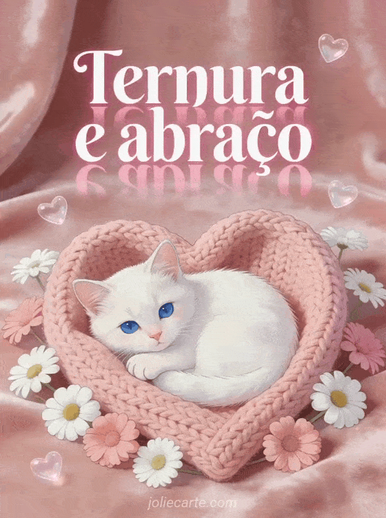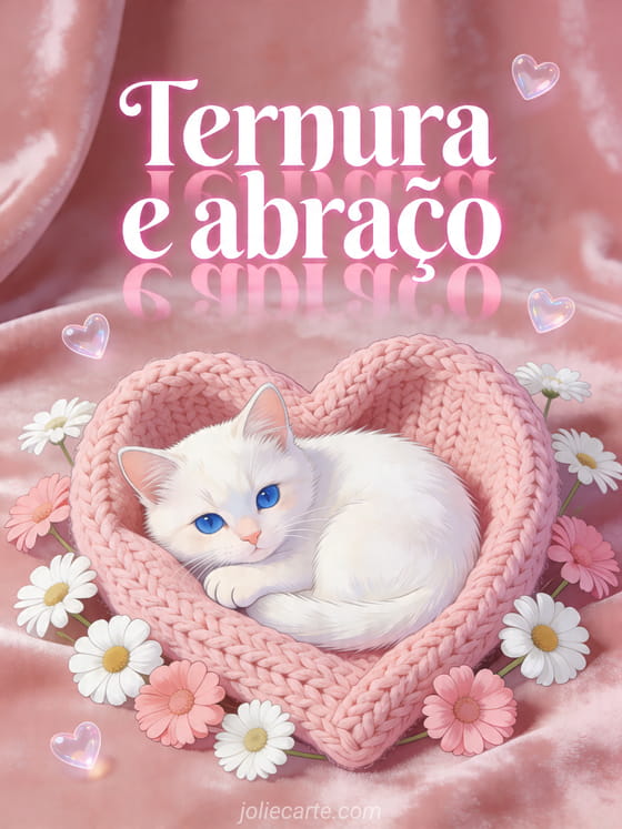 Envie uma mensagem quente e terna com este cartão grátis de abraço com um gatinho branco, uma manta tricotada em forma de coração e flores românticas. Veja também um abraço para você meu amor, ternura abraços afeto ou abraço romântico foto de casal apaixonado.