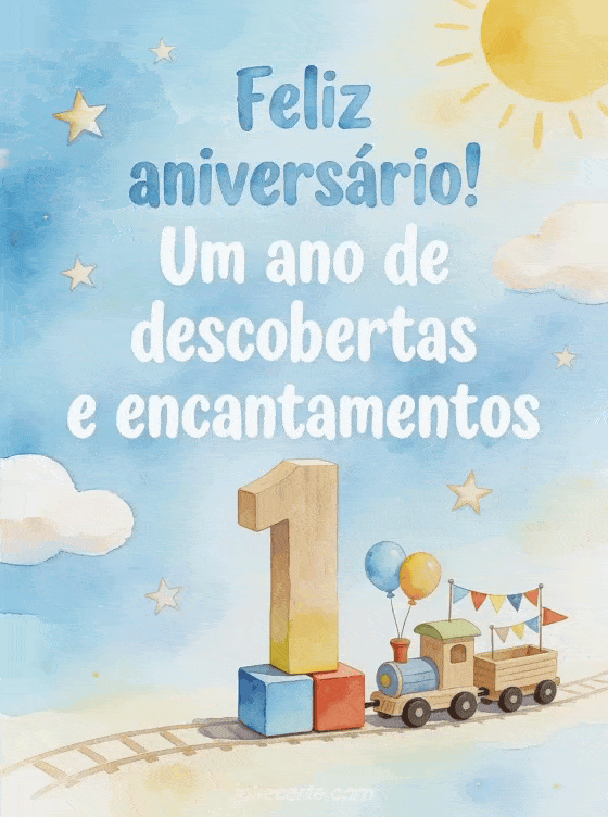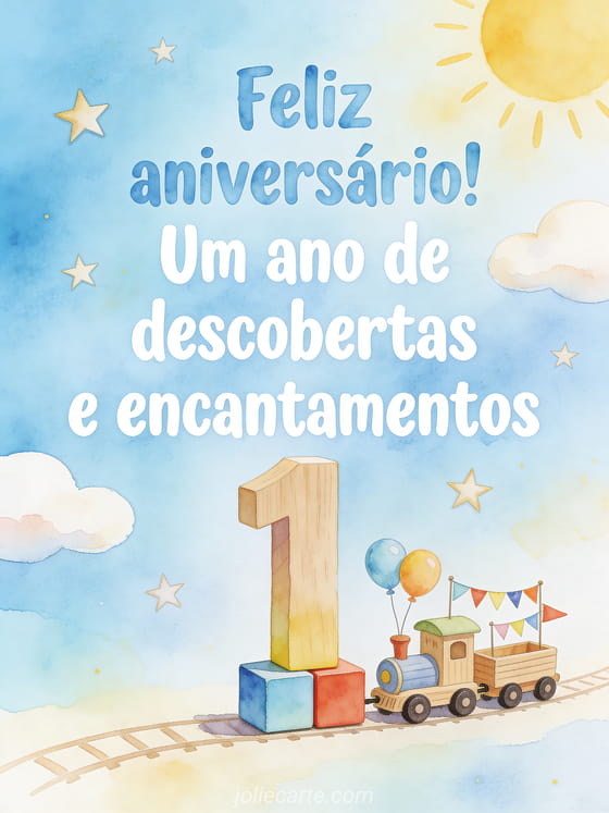 Celebre o primeiro ano de um bebê menino com um cartão suave em aquarela que mostra blocos de madeira formando o número 1, um trenzinho de brinquedo com balões e bandeirinhas, nuvens suaves, estrelas e luz azul-celeste. Veja também bebê deseja feliz aniversário, feliz aniversário meu bebê 2 anos ou texto aniversário bebê 1 ano.