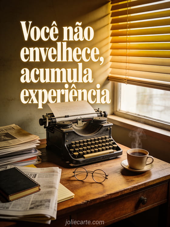 Surpreenda-o com uma mensagem divertida de aniversário que diz "Você não envelhece, acumula experiência." Este cartão grátis apresenta uma máquina de escrever vintage e uma mesa de redator antiga com um toque de humor intelectual. Descubra também um cartão aniversário homem humor ou uma citação aniversário homem.
