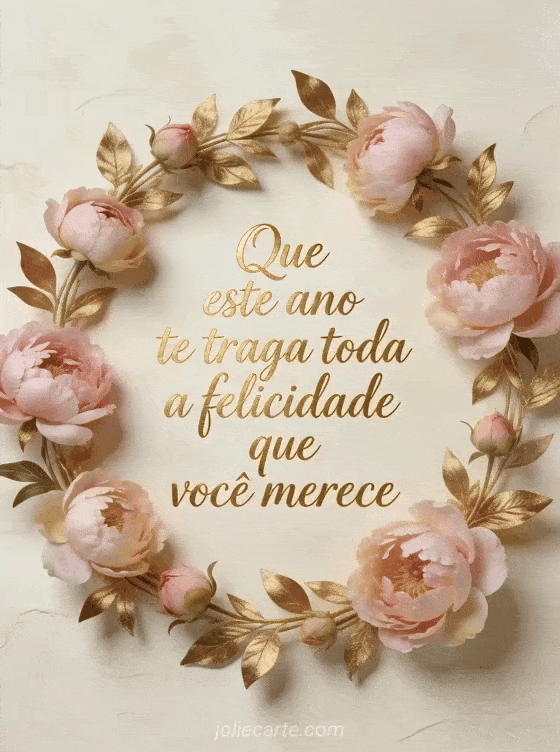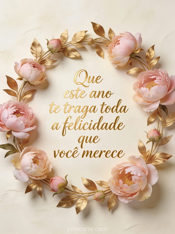 Deseje feliz aniversário com esta carinhosa mensagem: "Que este ano te traga toda a felicidade que você merece." Este elegante cartão apresenta delicadas guirlandas de peônias rosa pálido e folhagem dourada sobre fundo creme texturizado. Descubra também uma citação aniversário mulher ou um feliz aniversário mulher chique.