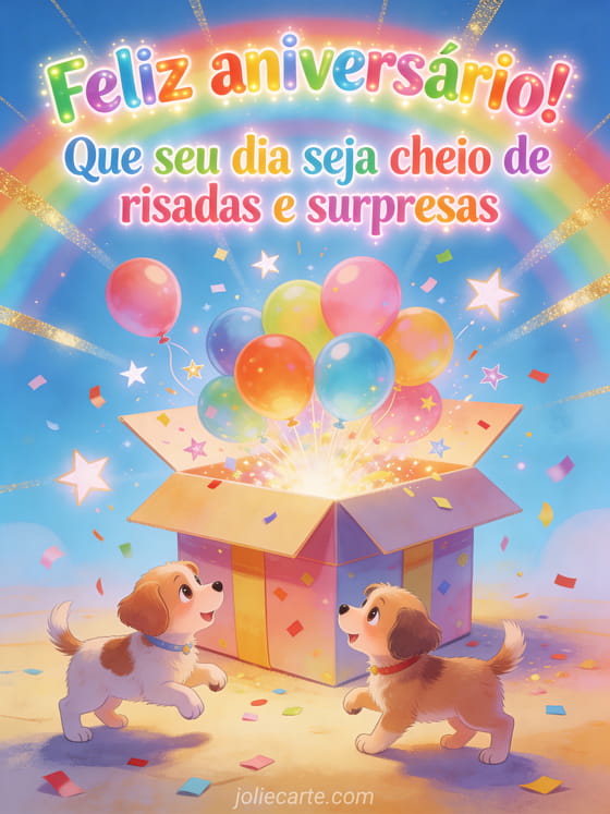 Envie este cartão mágico de aniversário com dois adoráveis filhotes observando uma explosão de balões coloridos e confete de uma caixa de presente gigante. Uma forma alegre de desejar feliz aniversário a uma criança. Descubra também um cartão de aniversário para meninas ou um cartão de aniversário para meninos.