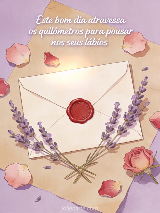 Compartilhe uma mensagem terna à distância com este cartão grátis de bom dia com uma carta selada, lavanda seca e pétalas de rosa sobre papel kraft. Veja também bom dia meu amor à distância, citação saudade amor distância ou mensagem amor à distância.