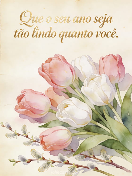 Envie um refinado cartão de aniversário com uma composição em aquarela de tulipas rosas e brancas com galhos de salgueiro sobre um fundo de pergaminho e a mensagem Que o seu ano seja tão lindo quanto você. Descubra também gifs feliz aniversário mulher ou uma mensagem feliz aniversário mulher.